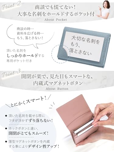 上質な本革と洗練されたバイカラーが、あなたのビジネスシーンを彩ります。マグネット式で開閉もスムーズ。最大50枚収納できるので、交流会などでも安心です。