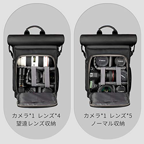 • コンパクトでも大容量: カメラ2台、レンズ5本、15.6インチPCまで収納可能。仕切りを自由にレイアウトできます。