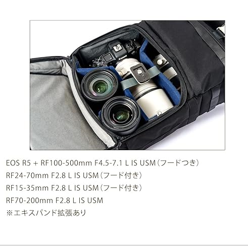 • 容量が拡張するエキスパンドシステム: ファスナーを開くことで機材収納部のマチが約5cm拡大。バッテリーグリップ付きのカメラなど、さらに大きな機材にも対応します。