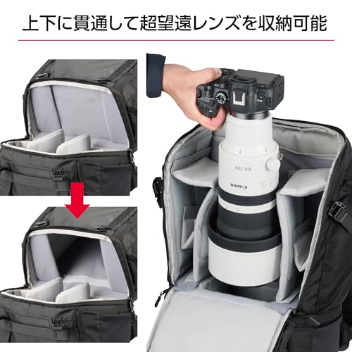 「野鳥や飛行機を撮るのが好き!」という方に朗報です。仕切りを外せば超望遠レンズをカメラに装着したまま収納可能!重い機材を快適に運べる設計なので、長時間のトレッキングでも疲れにくいのが特長です。