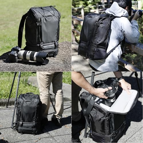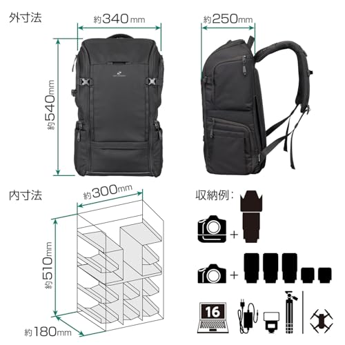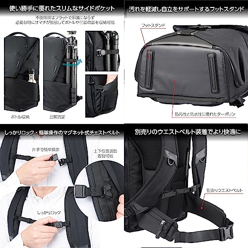 - 背面アクセス: リュックを地面に下ろして背面が大きく開くタイプ。機材全体を見渡しやすく、防犯面でも安心です。