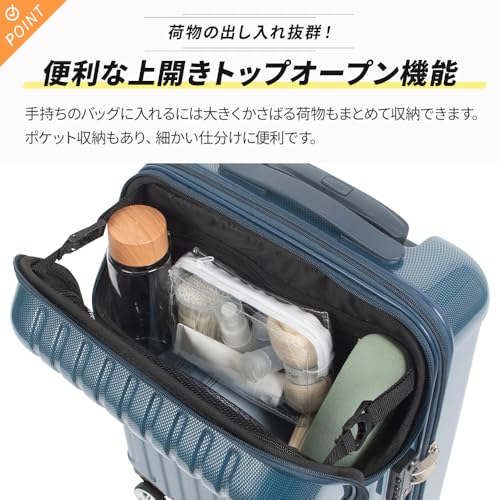 • フロントオープン: 前面が大きく開く。PCや書類、上着の収納に便利。 空港のロビーや新幹線の狭い座席でも、スーツケースを全開にする必要がありません。