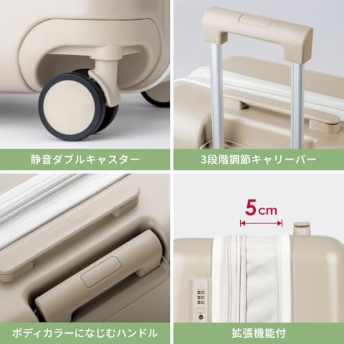 立てたまま荷物が取り出せるフロントオープンと、HINOMOTO製のストッパー付き静音キャスターが魅力。USBポートも搭載しており、移動中の充電にも便利です。
