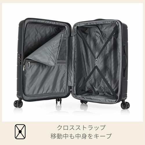 立てたまま荷物を取り出せるフロントオープン機能が非常に便利なモデル。HINOMOTO製のストッパー付き静音キャスターやUSBポートなど、現代の旅行者に嬉しい機能が満載です。