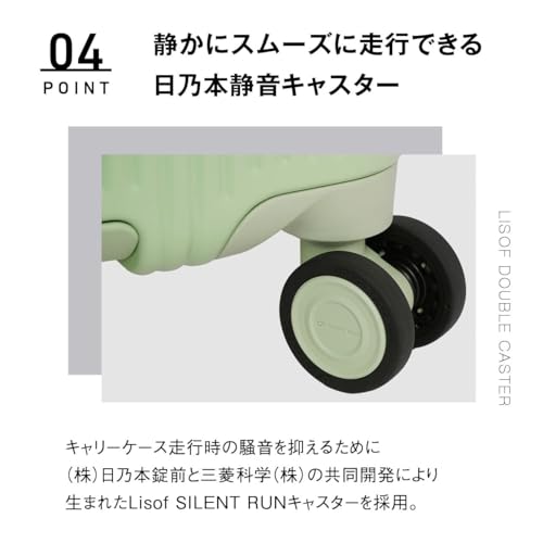 Oltimo最大の魅力は、キャスター性能です。日本の老舗部品メーカー「日乃本錠前」と「三菱ケミカル」が共同開発した特殊素材「Lisof(ライソフ)」を使用した静音キャスターを採用。これにより、従来のスーツケースの「ガラガラ」という走行音を劇的に軽減し、静かな場所でもストレスなく、滑るように移動できます。