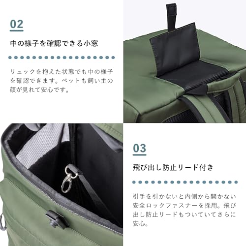 扉はガバッと大きく開くので、ペットの出し入れがとってもスムーズ。メッシュ素材なので通気性も抜群で、中の様子がしっかり見えるのも安心です。さらに、ファスナーは内側からは開けられない特殊な仕様になっているので、ペットが勝手に開けてしまう心配もありません。
